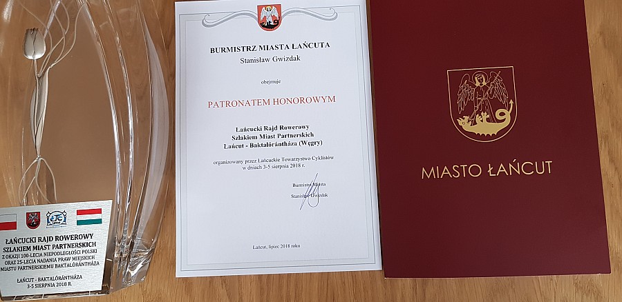 Łańcuckie Towarzystwo Cyklistów w Łańcucie daje wyraz swojego przywiązania do tradycji oraz dbanie o pamięć wartości patriotycznych. Rok 2018 jest rokiem szczególnym dla Polaków, ponieważ po 123 latach zaborów, Polska odzyskała swoją niepodległość i suwerenność. Członkowie Łańcuckiego Towarzystwa Cyklistów podjęli niesamowity wyczyn przejechania 350 km rowerami celem uczczenia wspaniałej rocznicy 100 lecia Niepodległości Polski Kolejnym powodem jest rocznica 25 lecia nadania praw miejskich partnerskiemu Miastu BAKTALORENTHAZA z Węgier, które współpracuje z Łańcutem od połowy lat 90 XX wieku . Miasto Łańcut współpracuje z miastem Baktalorenthaza w zakresie kultury, sportu itd. Podczas Dni Miasta Łańcuta i Powiatu Łańcuckiego Dyrektor Chóru z Baktalorenthaza Andras Kenez zaprosił cyklistów łańcuckich do odwiedzenia miasta. Łańcuckie Towarzystwo Cyklistów podjęło wyzwanie uczczenia wspólnie tak ważnych rocznic dla obu miast. Burmistrz Miasta Łańcuta Stanisław Gwizdak objął swoim patronatem honorowym Łańcucki Rajd Rowerowy Szlakiem Miast Partnerskich z okazji 100 lecia Niepodległości Polski i 25 lecia nadania praw miejskich Miastu Baktalorenthaza. Grupa rowerzystów w składzie Tadeusz Dubiel, Jerzy Szpunar, Bogdan Kuźniar, Edward Kurdziel , Jakub Jamrozik, Marcin Rupar oraz Tadeusz Lisowski jako wsparcie logistyczne o godzinie 6.oo w dniu 3.08.2018 r spotkała się z Burmistrzem Miasta Łańcuta na parkingu CENTRUM SPORTOWO-REKREACYJNEGO MOSiR w Łańcucie przed rozpoczęciem rajdu. Burmistrz przekazał życzenia dla Partnerskiego Miasta Baktalorenthaza a rowerzystom życzył szerokiej, bezpiecznej drogi oraz połamania szprych, by szczęśliwie wrócić do Łańcuta. Łańcuccy rowerzyści pokonają 700 km w 22 godziny tam i z powrotem. O godzinie 6.15 ruszyli w trasę, gdzie mgła spowijała miasto a z każdym przejechanym kilometrem temperatura rosła i stawała się coraz bardziej nieznośna. Łańcuccy rowerzyści dotarli do Baktalorenthaza o godzinie 22.30, gdzie powitał ich dyr.Andras Kenez z córką Lillą. W dniu 4.08.2018 r o godzinie 9.30 rowerzystów w obecności Andras Kenez powitali V-ce Burmistrz Baktalorenthazy Bela Komorny, V-ce Burmistrz Attila Kozma oraz Przewodniczący Komisji Edukacji,Kultury i Sportu Paul Gebre. Burmistrzowie Miasta opowiedzieli o historii miasta, jego walorach oraz mieszkańcach jak miasto szybko rozwija się i pięknieje z dnia na dzień. Cenią wieloletnią współpracę z miastem partnerskim Łańcut z Burmistrzami Łańcuta Jerzym Szczygieł oraz Stanisławem Gwizdak. V-ce Burmistrz Bela Komorny gratulował rowerzystom niesamowitej kondycji podczas wspaniałej wyprawy. Powiedział, że wizytą rowerzystów łańcuckich rozpoczynają obchody 25 lecia nadania praw miejskich. Natomiast V-ce Burmistrz Attila Kozma był zaskoczyny, że rowerzyści pokonali taki dystans 350 km w 11 godzin. Wspólnie z włodarzami miasta zwiedzano miasto m.in. Muzeum Zamkowe Degenfelda, które zostało oddane do użytku 2016 roku. Prezes ŁTC Tadeusz Dubiel przekazał życzenia dla władz miasta i mieszkańców Baktalorenthaza od Burmistrza Miasta Łańcuta Stanisława Gwizdak oraz cyklistów łańcuckich najlepsze życzenia by miasto rozwijało się, przysparzało mieszkańcom wiele radości, satysfakcji i również odwiedzali Łańcut niekoniecznie na rowerach. Następnie rowerzyści zwiedzili Sanktuarium Maryjne w Mariapocs oraz termy .Na zakończenie przyjacielskiej wizyty rowerzyści przekazali włodarzom miasta oraz Andras Kenez okazałe puchary rajdu . W drodze powrotnej rowerzyści pożegnali się z Andras Kenez i jego rodziną na wspaniałym śniadaniu. Członkowie Łańcuckiego Towarzystwa Cyklistów tak wspaniałym wyczynem uczcili 100 lecie Niepodległości Polski oraz 25 lecie nadania praw miejskich Miastu Baktalorenthaza przez Premiera Węgier w dniu 1.09.1993 roku. Łańcuccy rowerzyści wrócili do domu uszczęśliwieni i cali, że udało się pokonać taki dystans bez uszczerbku na zdrowiu i awarii.!