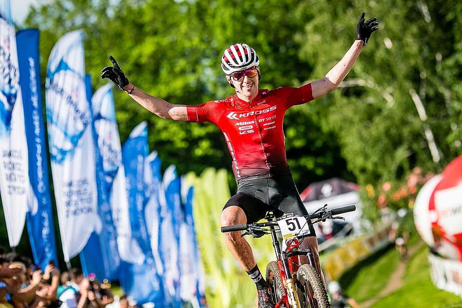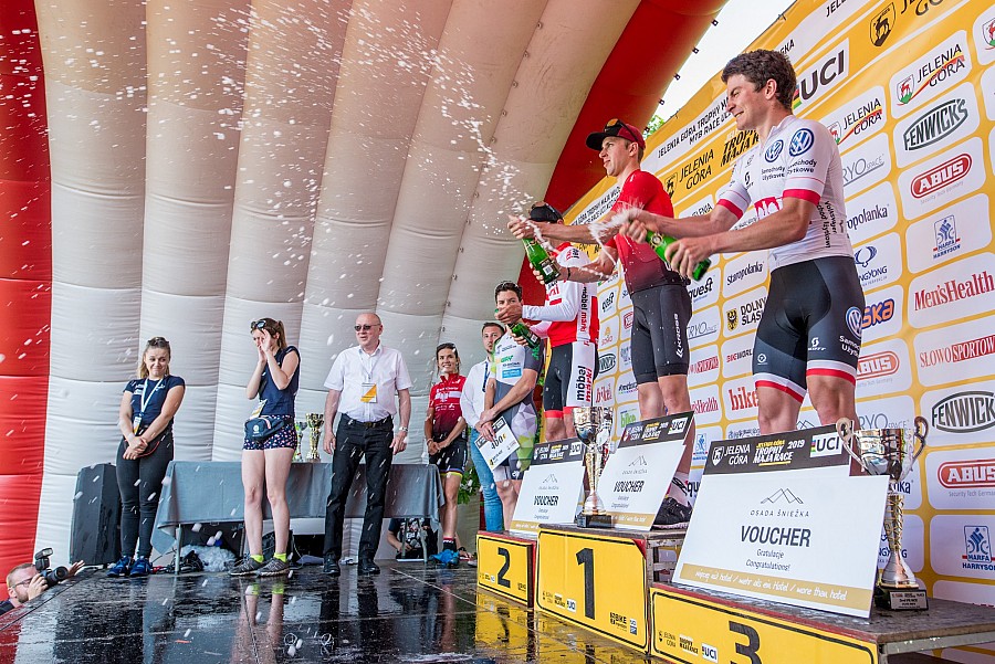Panowie ruszyli na swoje mordercze sześć rund w potwornym upale o godz. 16:00, a po elicie wystartowali jeszcze również zawodnicy ścigający się w kategorii U23. Przez pierwsze trzy okrążenia niczego jeszcze nie można było przesądzać, choć podejrzenia co do planów Ondreja Cinka (Kross Racing Team) mogły się już delikatnie nasuwać. Współpraca Czecha z klubowym partnerem Sergio Manteconem obliczona była chyba na jedno – na stopniowe wykończenie rywali. Hiszpan jednak wyścigu nie ukończył, ale Czech wciąż kontynuował walkę o zwycięstwo. Nie musiał się oglądać ze siebie żeby słyszeć i czuć pogoń siedzącą mu stale na plecach – Karl Markt (Moebel Marki MTB Pro Team), mistrz Polski Bartłomiej Wawak (Kross Racing Team), Oliver Ben z Nowej Zelandii, Martin Gluth (Niemcy, Superior XC Team) czy Kevin Panhuyzen z Belgii (G-skin Factory Team) nie chcieli dać się ograć. Znakomita jazda Wawaka rozgrzewała polskich kibiców, a przewaga Cinka wciąż nie była zbyt duża. Nie zwiększała się, ale zupełnie też nie chciała się zmniejszyć. Na kilometr przed metą było już wiadomo, że Czech ponownie w Jeleniej wygra. Stać go jeszcze było na to aby tuż przed podjazdem do mety nieco zwolnić i rzucić okiem na to co dzieje się z tyłu, a działo się sporo. Zdążył jeszcze samotnie wjechać na metę, zbierając gromkie brawa, a w tym samym czasie kilkadziesiąt metrów za nim trwała pasjonująca walka o srebro. Markt mija „kreskę” minimalnie przed Wawakiem, sekundę do nich traci Oliver Ben i taką mamy, ostatecznie, kolejność na mecie.