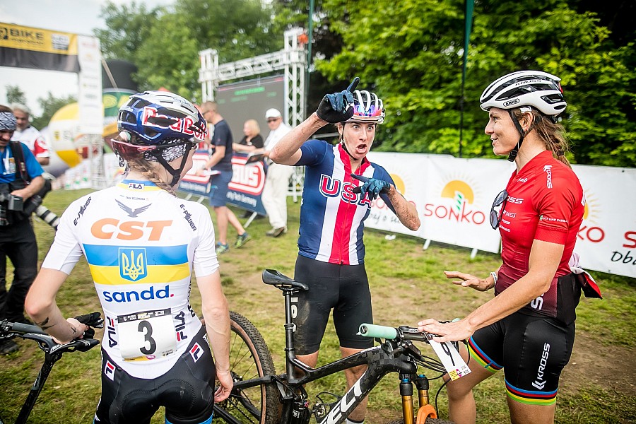 W zasadzie już od pierwszej rundy warunki dyktowała Bielomoina. Oddalała się rywalkom, a z goniącego ją pociągu, powoli odpadały pojedyncze, wycieńczone walką i upałem wagoniki. Ukrainka dotarła do mety jako pierwsza i wygrała w imponującym stylu, utrzymując sporą przewagą nad rywalkami. W sobotę po prostu była najlepsza. Drugie miejsce zajęła dzielna Lea Davison, która w trakcie wyściga ścigała się głównie z Anne Tauber, zamieniając się z nią cały czas miejscami. Ostatecznie dojechała druga, a Tauber trzecia, ku sporej radości Barta Brentjensa, wyczekującego na mecie na swoje podopieczne z teamu CST Sandd Bafang MTB Racing. Znów na uwagę zasługuje dobra jazda Aleksandry Podgórskiej (Volkswagen Samochody Użytkowe MTB Team), która dojechała do mety na 9. pozycji, będąc najlepszą z Polek. Maja Włoszczowska w tym roku nie startowała. Witała na mecie wszystkie finiszujące zawodniczki, gratulowała koleżankom i znakomicie wywiązywała się z roli gospodyni. Wcześniej zagrzewała też do boju dzieci startujące w wyścigach dla najmłodszych.