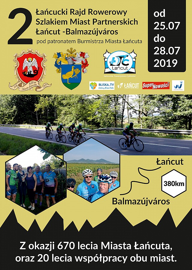 Grupa rowerzystów Łańcuckiego Towarzystwa Cyklistów w Łańcucie w dniach 25-28 lipiec 2019 r z okazji 670 ledcia Miasta Łańcuta oraz 20 lecia wpółpracy z węgierskim miastem Balmazujvaros postanowiła uczcić te zacne rocznice na sportowo. Współpraca miast rozpoczęła się w 1999 r na płasdzczyźnie samorządowej,edukacyjnej sportowwej i turystycznej a kontakty trwają do dziś. Kolarze pokonaja 380 km w 14 godzin by dotrzeć do Balmazujvaros.Rajd został objęty Patronatem Honorowym Burmistrza Miasta Łańcuta .