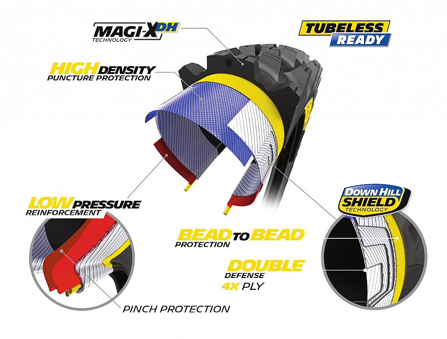 Nowość od Michelin wyróżnia najwyższy poziom przyczepności oraz odporność na uszkodzenia w trudnym terenie. Uzyskanie powyższych właściwości to efekt zastosowania mieszanki bieżnika MAGI-X DH, rozwiązania Double Defense 4X-Ply, wzmocnienia niskociśnieniowego Low Pressure Reinforcement oraz antyprzebiciowej wkładki o wysokiej gęstości High Density Puncture Protection, zintegrowanej z konstrukcją karkasu:
