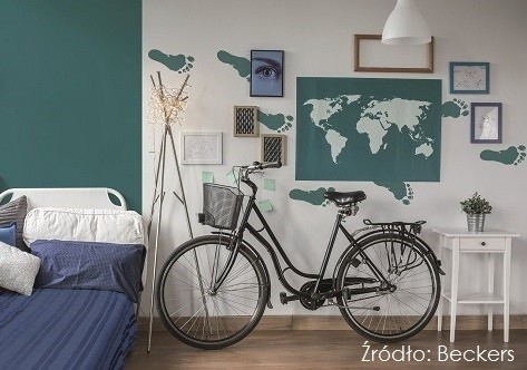 Motyw roweru w mieszkaniu to idealny patent dla podróżników. Szczególnie efektownie będzie prezentował się na spójnym tematycznie tle w postaci ściennej mapy pomalowanej farbą w kolorze Cleopatra z palety Beckers Designer Colour. Globtroterski charakter urządzonego w tym duchu wnętrza podkreślą ślady stóp na ścianie i rozmaite pamiątki z wojaży.