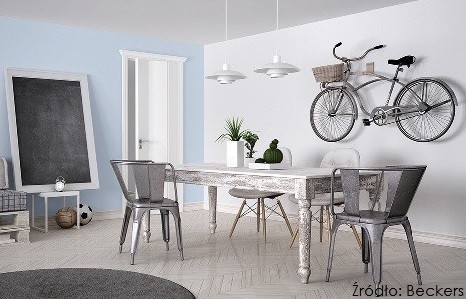 Nieoczywiste zastosowanie przedmiotów codziennego użytku w aranżacji potrafi przemienić przeciętne wnętrze w całkowicie nietuzinkową przestrzeń. Zawieszony na ścianie rower będzie stanowić efektowną dekorację pokoju, nie zajmując niepotrzebnie miejsca. To ważne, szczególnie w przypadku małego metrażu. W tak swobodnej estetyce świetnie sprawdzi się wykonana z europalet kanapa. Nadgryziony zębem czasu, stary drewniany stół doda całości uroku, a ściana w delikatnym odcieniu Mist z palety Beckers Designer Collection dopełni stylizację, wprowadzając w błogi, sentymentalny nastrój.