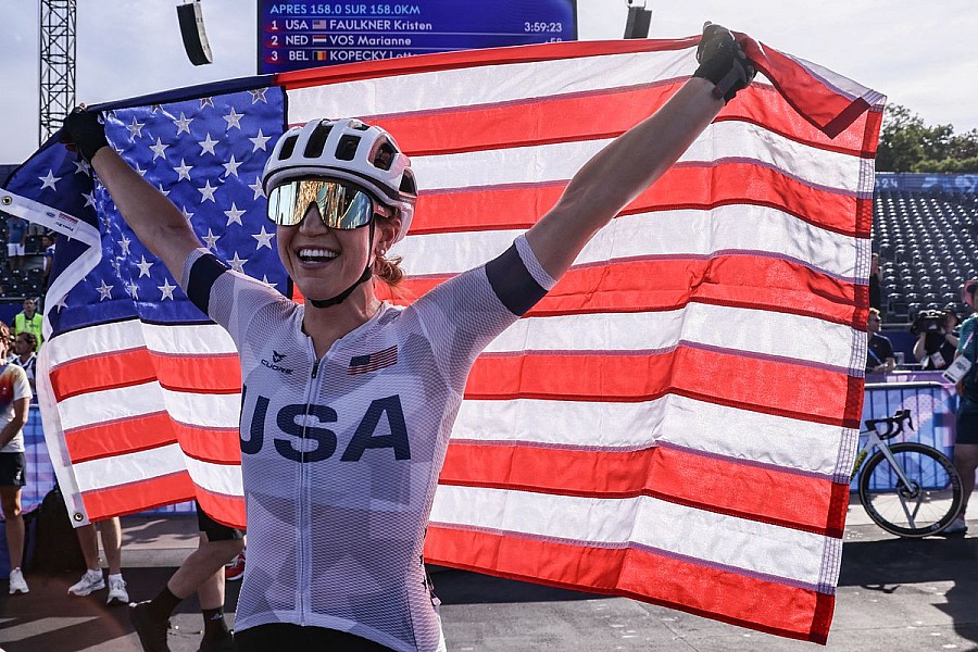 Kristen Faulkner (USA) zdobyła złoty medal w wyścigu ze startu wspólnego na XXXIII Letnich Igrzyskach Olimpijskich w Paryżu. Ze srebrnego krążka mogła cieszyć się Holenderka Marianne Vos a Belgijka Lotte Kopecky przekroczyła linię mety jako 3 po zaciętej końcówce. Najlepsza z Polek, Katarzyna Niewiadoma, zajęła 8. miejsce, a Marta Lach była 10. Obie mogą mówić o dużym pechu.