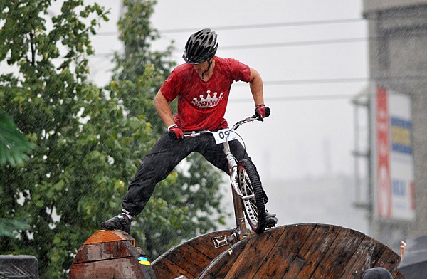 Momentalnie okazało się, że jazda w deszczu jest naprawdę dużym wyzwaniem, gdyż przejazd po niektórych elementach toru, takich jak samochody czy drewniane szpule, w momencie gdy są one mokre, okazał się nie lada wyczynem. Z tego powodu, najtrudniejszy element toru (a była nim bez wątpienia konstrukcja z dwóch samochodów) pokonało zaledwie kilku cyklistów.