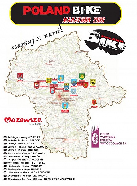 14 miejscowości znalazło się na mapie Poland Bike Marathon 2010 czyli o 5 więcej niż w debiutanckim roku tego cyklu. W drugim sezonie Poland Bike Marathon odwiedzi Kobyłkę, Serock, Płock, Górę Kalwarię (Zamek Czersk), Łochów, Sulejówek, Łuków, Zakroczym, Urle, Węgrów, Tłuszcz, Pomiechówek, Legionowo i Nowy Dwór Mazowiecki (Twierdza Modlin).
