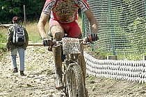 Zaraz za bufetem - podjazd na Przeł. Kolędówka. Tutaj przydałoby się mieć nogi ze stali. Jak by było sucho to może miałbym szansę tutaj wjechać na rowerze. Tym razem udało mi się podjechać 10m. na początku i ok. 10 m. gdzieś w połowie. Trzeba przyznać, że rzeczywiście jest to szlak do turystyki pieszej, a nie rowerowej. Duże nachylenie i dwie rynny zamiast ścieżki, a do tego pełno błota. Samo podchodzenie z rowerem było wyczerpujące, więc nie zdziwiłem się, że nie widziałem nikogo, kto przejechał by ten odcinek na rowerze. Jak wsiadłem na rower, czułem się tak fatalnie, że zacząłem się zastanawiać, który dystans wybrać na rozjeździe, który był kilkaset metrów dalej. Na starcie planowałem pojechać sobie na mega, ale w momencie wyczerpania fizycznego wymiękłem i postanowiłem zakończyć wyścig zjazdem na MINI. Z opowieści wiem, że dystans mega był jeszcze trudniejszy niż mini - podjazdy po błocie, więc może i dobrze, że zrezygnowałem. Ale za 2 tygodnie na pewno pojadę na MEGA w Świeradowie.