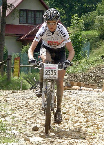 Zjazd do mety to była czysta przyjemność - kręta asfaltowa uliczka i na koniec, tradycyjnie: 2 km. ścieżka nad potokiem z trawą błotem, tłuczniem i asfaltem. Dojechałem z czasem 58 min. Poprawiłem się w stosunku do zeszłego roku o 5 min. ale miejsca nie poprawiłem. Na MEGA i tak bym nie uzyskał dobrego wyniku, ponieważ w tym roku Zawoja gościła całą krajową czołówkę MTB : Galiński, Piotr i Adrian Brzózka, Kornel Osicki (Mega) i Dariusz Batek (Giga). a wśród kobiet: Anna Szafraniec, Karolina Kozela i Magdalena Balana (Mega). Taaakiej obsady chyba jeszcze w bikemaratonie nie było.