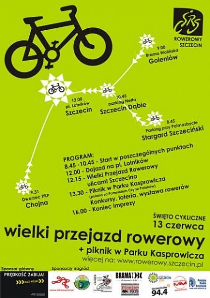 po ponad godzinnym przejeździe ulicami miasta zaplanowano festyn rowerowy w Parku Kasprowicza. Na miejscu: wystawa nietypowych rowerów, muzyka, nagrody i konkursy. Więcej: Święto Cykliczne - Wielki Przejazd Rowerowy.