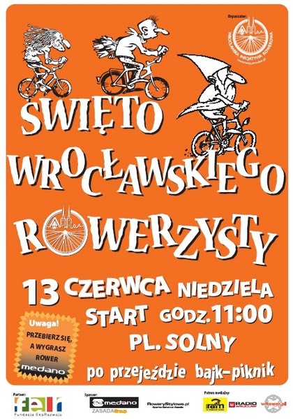 Po peletonie ulicami miasta Bajk - piknik na Bulwarze Dunikowskiego. Na miejscu policjanci będą przeprowadzać akcję znakowania rowerów markerem pomagającym w identyfikacji pojazdu w przypadku kradzieży. Warto też pomyśleć o zabawnym, szalonym, nietypowym przebraniu. Najbardziej odlotowo ubrany rowerzysta odjedzie z imprezy nowiutkim rowerem Medano Artist Yellow. Więcej na ŚWIĘTO WROCŁAWSKIEGO ROWERZYSTY 13 czerwca, pl. Solny 11:00.