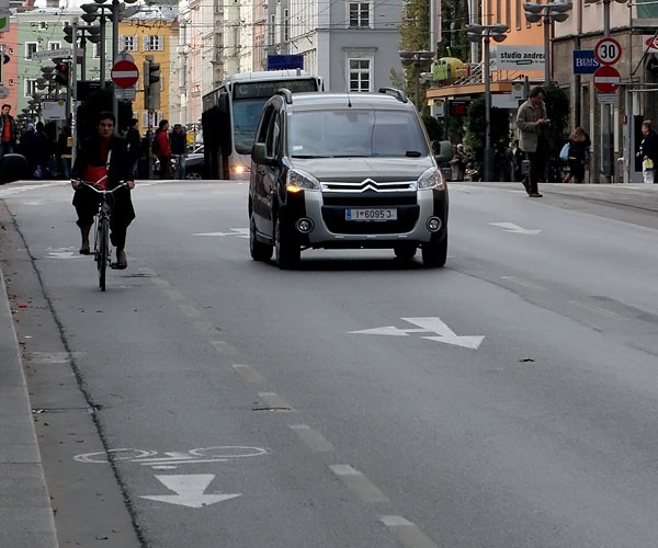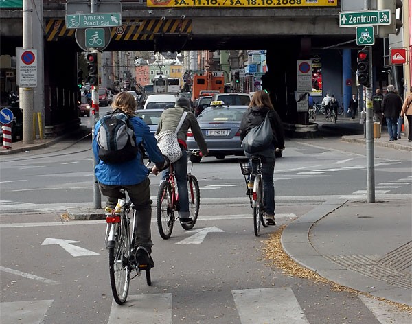 W Innsbrucku jest zhierarchizowany układ drogowy. Szkielet komunikacyjny tworzą drogi główne, na których są zakazy wjazdów dla rowerzystów. Ale za to wzdłuż nich wybudowane są dojazdowe drogi rowerowo-samochodowe, po których można przemieszczać się bezpiecznie i bardzo szybko. Na wszystkich drogach niższej kategorii dozwolony jest ruch rowerowy w wyznaczonych pasach przy prawej krawędzi jezdni. Specjalnie dla rowerzystów przygotowana jest sygnalizacja świetlna i oznaczenia drogowe. Kultura jazdy jest na tak wysokim poziomie, że żaden kierowca nie skręci w prawo, jeśli widzi w lusterku wstecznym rowerzystę zbliżającego się do skrzyżowania. U nas rowerzyści też są zauważani przez kierowców, ale dopiero wtedy, jeśli znajdują się już na masce samochodu.