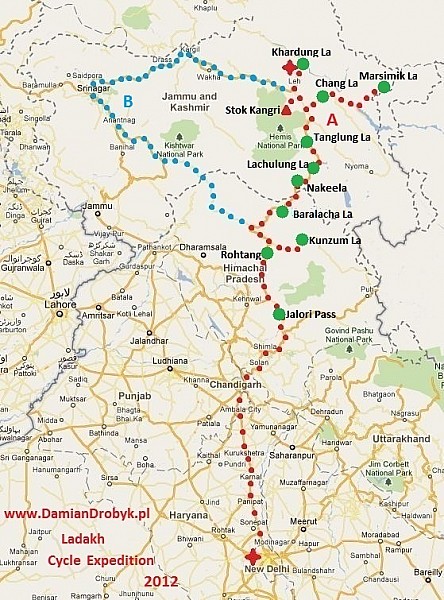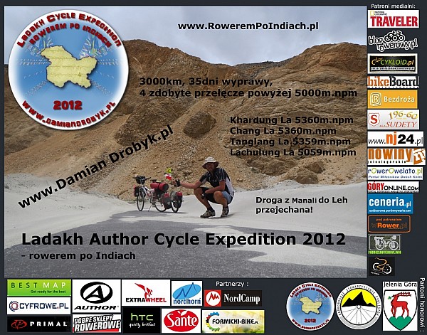Podczas samotnej miesięcznej wyprawy rowerowej po Indiach Północnych o nazwie Ladakh Author Cycle Expedition 2012 przejechałem ponad 2989.72km. Udało mi się zdobyć cztery przełęcze powyżej 5000m.npm w tym trzy najwyższe drogowe przełęcze Indii i jedne z najwyższych na Świecie. Są to Khardung La 5360m, Chang La 5360m oraz Taglang La 5328m. Przełęcz Chang La zdobyłem dwukrotnie od strony południowej jak i północnej. W ciągu 7 dni przejechałem jedną z najwyższych dróg na Świecie z Manali do Leh zaliczając po drodze przełęcze: Rohtang Pass 3975m, Baralacha La 4980m, Nakeela 4900m, Lachulung La 5065m oraz Taglang La 5328m a także kilka innych przełęczy i podjazdów powyżej 3000 i 4000m.npm, łącznie zdobyłem 18 podjazdów. Dojechałem do miasteczka Lukung oraz jeździłem wzdłuż przepięknego jeziora Pangong na wysokości 4200m. Zwiedziłem piękne hinduskie miasta Shimla, Manali, Leh, Kargil, Srinagar, Dharamsala czy ogromną stolicę Indii - Delhi. W Delhi zwiedziłem okolice Czerwonego Fortu, Stare Delhi a także monument India Gate oraz teren wokół głównych budynków urzędujących polityków i prezydenta Indii. Odwiedziłem MacLeodganj, miejsce pobytu Dalai Lamy. Przejechałem kilkaset kilometrów wzdłuż doliny rzeki Indus w krainie Ladakh nazywanym "Małym Tybetem" czy też "Krajem wysokich przełęczy". W Ladakh mogłem podziwiać oprócz kolorowych stup, zacisznych gomp czy świątyń osadzonych na skałach także największy buddyjski monastyr - Hemis. Spotkałem się z trzema odmiennymi od siebie religiami Hinduizmem, Buddyzmem oraz Islamem. Poznałem wiele hinduskich zwyczajów jak również miałem przyjemność spróbować ostrej ale wyśmienitej hinduskiej kuchni, wielu owoców a także słodkich przysmaków.