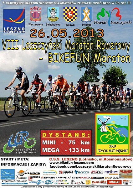 Serdecznie zapraszamy na największy maraton szosowy dla amatorów ze startu wspólnego w Polsce czyli VIII Leszczyński Maraton Rowerowy – Bikefun Maraton, który odbędzie się 26 maja 2013 roku w okolicach Leszna (pow. leszczyńskie, woj. wielkopolskie).