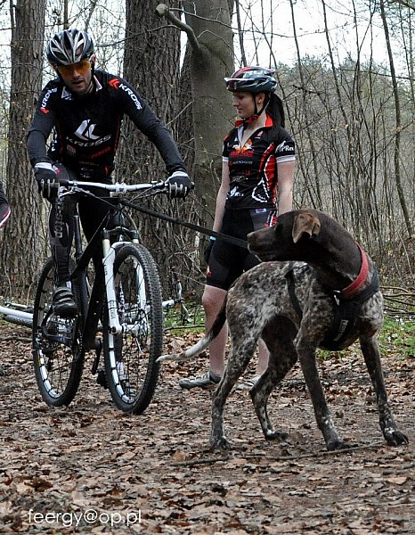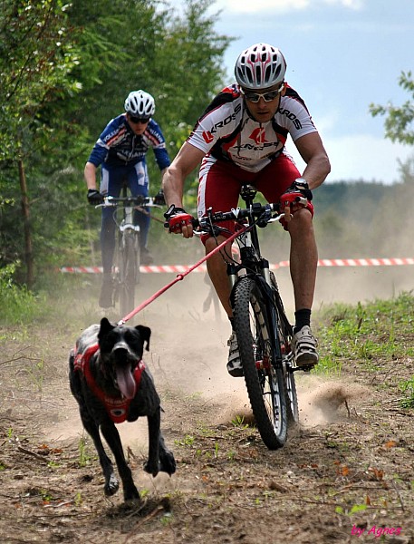 Igor Tracz: Podczas wyścigów zaprzęgiem pomoc biegowa ze strony zawodnika jest niezbędna na podbiegach, z reguły interwałowa praca zawodnika kończy się kiedy psy wpadają na prostą lub zjazd. W bikejoringu pies bardzo szybko rozpędza kolarza na starcie, na wyjściu z zakrętu zbiera się dużo szybciej, pomaga pokonać trudne odcinki, jest tylko jedno ale....nie ma opcji dozowania mocy, pies daje z siebie ile może, a my musimy operować hamulcami, balansem ciała i jak najmniej mu przeszkadzać. Na szybkich prostych i zjazdach gdy prędkość przekracza 50 km/h jedzie się już na luźnej linie ciągowej. Na tym to polega, aby jak najczęściej luzować tą linę ciągową, aby jak najbardziej odciążyć psa.Na mecie pies i ja ledwo żyjemy.