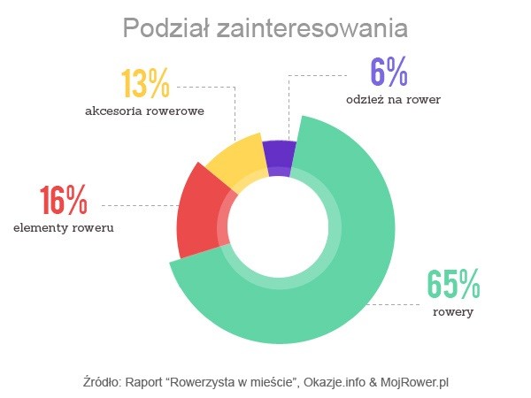 Jeśli chodzi o podział zainteresowania wśród wszystkich kategorii związanych z rowerami na Okazje.info, profesjonalna odzież rowerowa cieszyła się najmniejszym zainteresowaniem. Ilość odwiedzin na poziomie 6,2% jasno wskazuje, że podróż rowerem nie wiąże się już dziś z koniecznością zakupu odpowiedniej odzieży. Internauci skupiają swoją uwagę na samych rowerach i akcesoriach do nich (razem rowery, części rowerowe i akcesoria – niemal 94%).