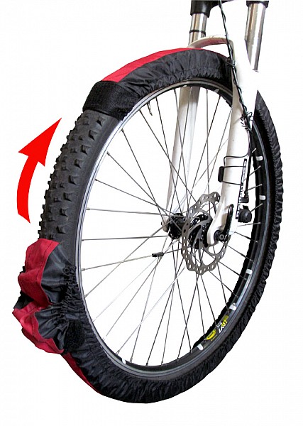 Opaska wykonana jest z bardzo wytrzymałego nylonu odpornego na warunki atmosferyczne i ścieranie. Zapinany na rzepę tak, że nie blokuje koła nawet przy hamulcach V i można spokojnie przemieszczać rower na kołach. Dodam że obecnie jest on w sprzedaży w moim sklepie internetowym na koła 26 i 29 cali.