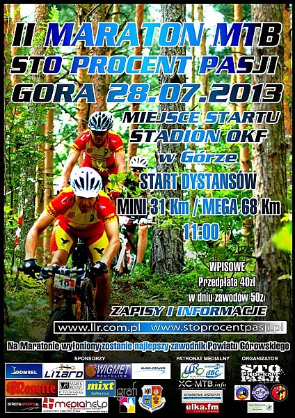 Już po raz drugi - 28 lipca 2013 – w okolicach Góry Śląskiej wystartuje Maraton MTB Sto Procent Pasji. Zawody rozegrane zostaną na dwóch dystansach, dla każdego kto choć trochę jeździ rowerem przygotowano liczący 31km dystans MINI oraz trudniejszy pod względem technicznym a także długości, liczący około 68 km dla bardziej wytrenowanych osób. Ponadto organizator oprócz wyścigów z cyklu Leszczyńskiej Ligi Rowerowej zapewnia wyścigi dla najmłodszych a także liczne atrakcje dla dzieci takie jak malowanie twarzy, dmuchana zjeżdżalnia czy zabawy na orliku. Dla wszystkich zawodników udostępniony zostanie basen kąpielowy a także serwis przed i po maratonie.