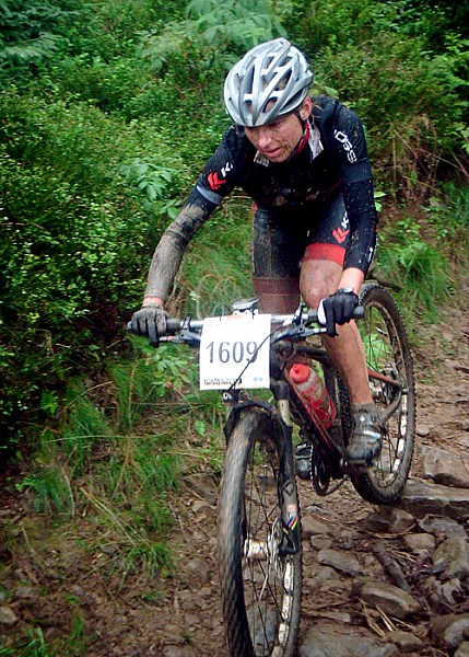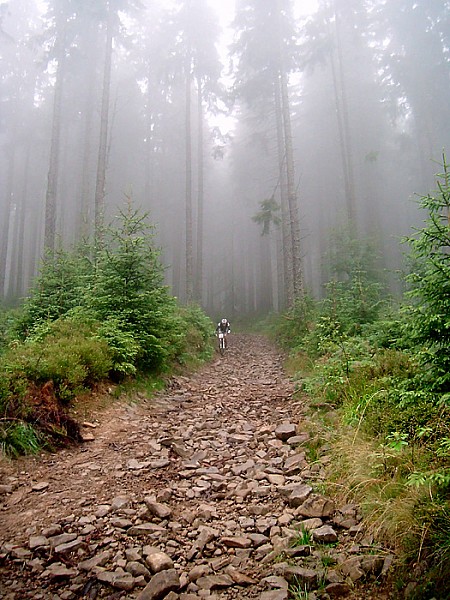 .... Ale pogoda zrobiła niezłego psikusa, nie dość, że poprzedniej nocy szalała burza, to w dzień startu nad całymi górami zawisła gęsta mgła, która właściwie przesłoniła wszystko, widoczność czasem sięgała raptem kilku metrów. Zamiast obiecanych pięknych widoków mieliśmy piękne błotko, niekończące się śliskie potoki kamieni i wypełzające zewsząd korzenie. Zatem druga obietnica odnośnie satysfakcjonującej technicznie trasy spełniona została nawet z nawiązką.