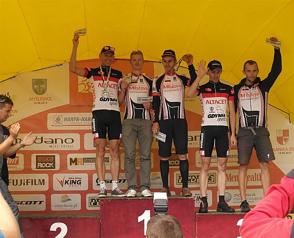 Co o wyścigu w Lublinie powiedział Patryk: Przed startem miałem mieszane uczucia. Z jednej strony "noga" na rozgrzewce była ok, z drugiej pojawili się zawodnicy z WKK co komplikowało wstępne predykcje wyników. Trasa umiejscowiona na stoku narciarskim zapowiadała typowo kondycyjny wyścig, bez sekcji technicznych, a szkoda ;-(. Po starcie tempo narzucili kolarze z WKK, ich mocna jazda uplasowała mnie na ok. 4/5 miejscu. Trwało to do połowy okrążenia, gdy tempo się ustatkowało przypuściłem atak wychodząc na prowadzenie. To był dobra decyzja a sytuacja nie zmieniła się aż do mety. Po pierwszym kółku zyskałem kilkanaście sekund, do których dokładałem kolejne zwiększając przewagę na każdym kółku, by ostatecznie na mecie zameldować się z przewagą 2min 54sek, tym samym wygrywając w kategorii i open. Jazda przebiegała podobnie jak przed tygodniem, spokojnie z możliwością kontrolowania pozycji. Nie obyło się również bez wpadek. Lekko przestrzelony zakrętu zmusił mnie do postoju i wyplątywania foliowej taśmy z napędu, na szczęście bez przykrych konsekwencji.