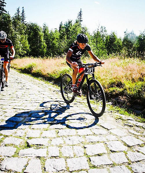Śnieżkę dobrze znam z czasów dzieciństwa, kiedy to zdobywało się ją piechotą, zawsze była taka magiczna i oferowała przepiękne widoki na otaczającą okolicę. Dlatego zawsze chętnie tam wracam, a jeszcze chętniej, gdy mogę tam wjechać rowerem! W sobotę rano - 9 sierpnia - deptak w Karpaczu opanowany został przez uczestników wyścigu. Punktualnie o 10 wszyscy ruszyliśmy na 14-o kilometrową trasę. Łącznie mieliśmy do podjechania ok 1000 metrów w pionie. Początek to kilka kilometrów główną asfaltową drogą przez Karpacz - dobrze znana z maratonów startujących w Karpaczu - aż do Świątyni Wang. Właściwie dopiero tam, gdy wjeżdża się na kostkę brukową, rozpoczyna się prawdziwy wyścig. Nachylenie jest zmienne, są fragmenty, gdy rzeczywiście robi się bardzo stromo, ale najbardziej chyba daje się we znaki nierówna kostka brukowa, która nieustannie wybija z rytmu. Do tego czasem musimy toczyć walkę z silnym wiatrem, który na odkrytej przestrzeni hula sobie dość odważnie.