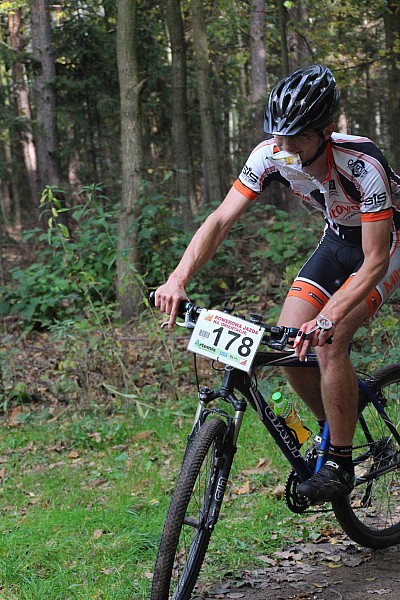 Biorąc mapę, nieco zaskoczony dowiaduję się, że tym razem mamy do zrobienia dwie pętle na mapach o różnej skali. Na początek dostaję 1:15 000 z 18-stoma ciasno upchanymi punktami kontrolnymi do zaliczenia. Chwila na zapoznanie się z mapą i start. Tradycyjnie już, początek okazał się dla mnie trudny. Doskwiera chłód, a po wjechaniu do lasu nie bardzo wiadomo co myśleć. Jest pięknie. Malownicze pagórki, dookoła złota polska jesień, wszystko zasnute gęstą warstwą liści. Wszystko, włącznie z każdą ścieżką, przez co wiele z nich ciężko jest w ogóle dojrzeć. Jadę na PK 2, ale co rusz zwalniam i tak właściwie to nie bardzo wiem co dalej. Inni rozjeżdżają się po drodze na różne strony, skręcając w rozwidlenia, których nawet nie zauważyłem. Na szczęście udaje się dojechać bez zbytniego błądzenia. Na punkcie dziurkuję kartę i lecę dalej.