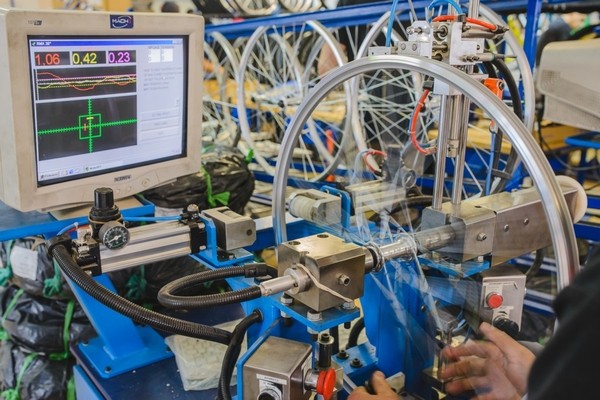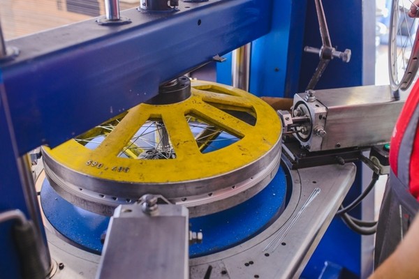 Następnie przy pomocy specjalnej maszyny łączy się szprychy z obręczą – trwa to dosłownie kilka sekund. Obie te czynności w Kellys Bicycles wykonywane są przez kobiety, które mają drobniejsze, sprytne palce i swoją pracę mogą wykonywać nawet z zamkniętymi oczami z niesamowitą dokładnością.