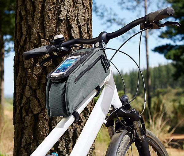 Wbrew pozorom torba w czasie jazdy trzymała się stabilnie, mimo że obawiałem się jej przekrzywiania - jest mocowana tylko do ramy dwoma rzepami i dodatkowo do główki ramy jednym rzepem. Do środka włożyłem kamizelkę odblaskową, okulary, klucze oraz chusteczki higieniczne, a do etui celowo rozładowany telefon wraz z podłączonym powerbankiem. O dziwo zmieściły się oba urządzenia w miejscu przeznaczonym dla smartfona, a myślałem, że powerbank będzie musiał być schowany w bocznej kieszeni torby. Pewnie dlatego tak się udało, że to mały telefon, a i powerbank niezbyt duży, ale nawet z dużymi urządzeniami torba spisałaby się bez problemu, tyle że w pierwotnie przeze mnie wymyślonej konfiguracji (osobno telefon, osobno bateria)...