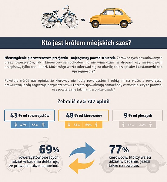 W tym celu zorganizowaliśmy akcję Król Szos, w wyniku której udało nam się zebrać ponad 5,5 tysiąca opinii, z czego 48% od kierowców, 43% od rowerzystów i 9% od pieszych. Co ciekawe, 69% biorących udział w badaniu rowerzystów zadeklarowało, że regularnie jeździ samochodem, a kierowców, którzy często przesiadają się na rower było aż 77%!