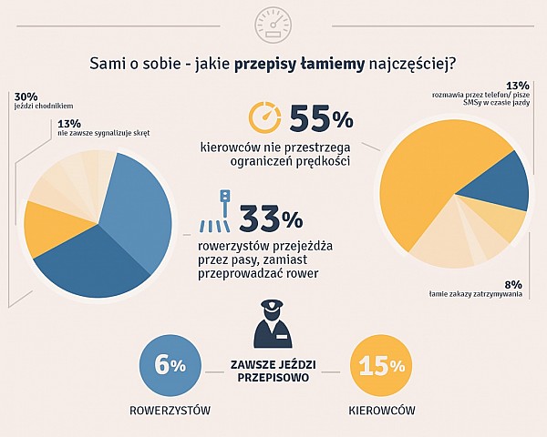 mówiącego też, że skręcające w prawo auta muszą im ustąpić. Aż 25% (1/4 biorących udział w badaniu kierowców!) nie ma świadomości istnienia tego przepisu, a więc jest potencjalnie mniej uważnych w sytuacjach, w których rowerzysta może wykorzystać to prawo. Z tych, którzy o nim wiedzą, tylko 27% popiera takie rozwiązanie, natomiast 46% wyraża się na jego temat zdecydowanie negatywnie. Wśród rowerzystów zdania są podzielone według dokładnie odwrotnych proporcji: niemal 50% uważa ten przepis za bardzo dobrą koncepcję, a tylko 25% jest mu przeciwna. Ilość rowerzystów nieświadomych istnienia tego przepisu to aż 24%! Wygląda na to, że ten przepis to nie tylko źródło niezgody pomiędzy rowerzystami, a kierowcami, ale też potencjalne źródło - czasem groźnych - nieporozumień na drodze.