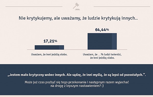 Wynika z tego, że choć jesteśmy wobec siebie wzajemnie dość wyrozumiali i akceptujący, większość z nas sądzi, że inni na drodze tacy nie są i odnoszą się do całej reszty krytycznie. JA nie jestem lepszy od innych, ale inni na pewno sądzą, że są.