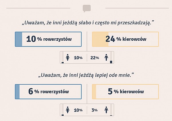Kierowcy nie są jednak krytyczni tylko i wyłącznie w stosunku do rowerzystów - dość ostro odnoszą się do siebie wzajemnie. Aż 24% respondentów uważa, że kierowcy generalnie jeżdżą słabo i często przeszkadzają na drodze. Wśród rowerzystów, krytyczne zdanie wobec siebie nawzajem ma tylko 10%.