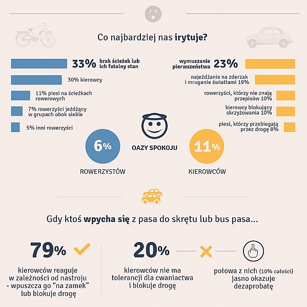 Na pierwszym miejscu listy powodów do irytacji rowerzystów pojawił się brak ścieżek lub ich fatalny stan (33%), ale już drugie, niechlubne miejsce przypadło w tej kategorii kierowcom (zwłaszcza jeśli wymuszają pierwszeństwo i chętnie używają klaksonu) - niemal 30%. Kierowcy mają jednak inne odczucia na drodze - najbardziej irytuje ich wymuszanie pierwszeństwa i najeżdżanie na zderzak, a jedynie 10% upatruje w rowerzystach powodu do złości na drodze. Kierowców i rowerzystów w dużej mierze irytuje więc to samo - inni kierowcy! Wobec siebie rowerzyści są też dużo bardziej wyrozumiali - tylko 5% deklaruje, że inni użytkownicy jednośladów są powodem do irytacji.
