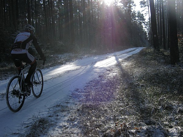 Moim zdaniem poza usystematyzowanymi treningami z mocą na szosie warto skoczyć w teren. Nawet jazda po zwykłym lesie jest lepsza niż żmudne ślęczenie na szosie i wyciskanie kilometrów. Przede wszystkim bardziej zmienne warunki terenowe wymuszają konieczność np. przepychania roweru w piasku, błocie czy pokonywania niewielkich pagórków. Ćwiczymy więc siłę i angażujemy więcej mięśni także rąk i tułowia. Trenujemy także (choćby nawet w niewielkim stopniu) technikę, o czym na szosie praktycznie nie ma mowy.