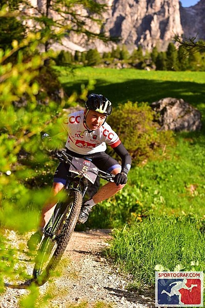 Po zjeździe do Arabby na bufecie wiedziałam już że tracę ok 2-3 minuty. Czułam się dobrze, więc podjazd na Passo Pordoi starałam się pokonać w swoim mocnym tempie. Tam czekał nas najtrudniejszy zjazd. Śliskie kamienie i korzenie czające się pod kołami trzeba było pokonywać niezwykle czujnie, by sprawnie dojechać do ostatniego wymagającego podjazdu na przełęcz Sella. Niestety moment nieuwagi przypłaciłam nieprzyjemną kraksą, gdzie cały impet uderzenia poszedł na moją klatkę piersiową. Pozbierałam się w miarę szybko, wyprostowałam siodełko i poobijana ruszyłam dalej.