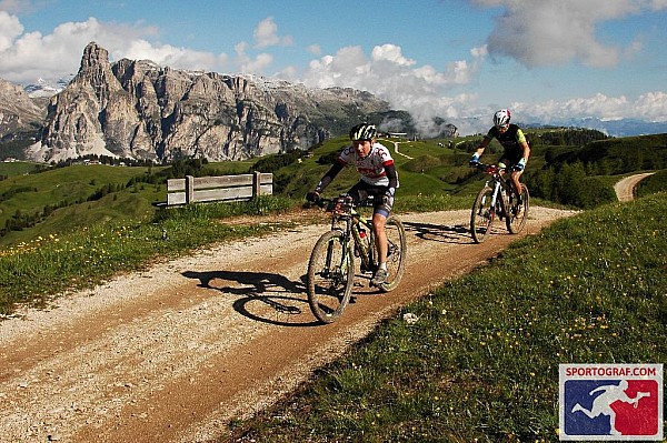 W końcu strzeliło konfetti i ulicami Selvy val Gardeny ruszył kobiecy peleton. Gdy tylko skończył się asfalt i wjechaliśmy w szutrową drogę wspinającą się zakosami do pierwszego szczytu, przesunęłam się na drugą pozycję, przede mną była Sally Bigham. Śmiało można stwierdzić, że w maratonach MTB to już legenda. Starałam się trzymać tempo i nie tracić za wiele, co nawet nieźle wyszło, bo na szczycie traciłam raptem 40 sekund i cały czas trzymałam kontakt wzrokowy. Niestety długi zjazd do Corvary nie był w moim wykonaniu zbyt dobry i moja strata urosła na tyle, że na kolejnym podjeździe ledwo dostrzegłam ją kilka serpentyn dalej, gdy wjechałam na odsłoniętą, wijącą się grzbietem górskim ścieżkę zbliżającą mnie się do drugiego szczytu Pralongia 2157 m.