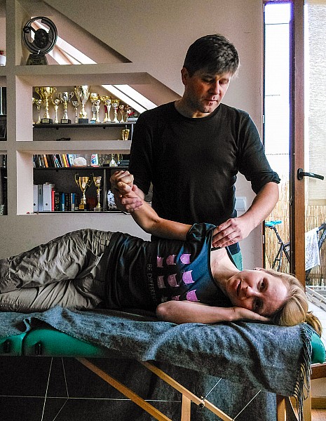Bardzo dobrze, jeśli jest możliwość stałego kontaktu z rehabilitantem. Ja mam to szczęście, że mogę z każdym problemem zgłosić się do świetnego fizjoterapeuty Tomasza Niedzwiedzkiego, który od lat współpracuje z kolarzami. Wystarczy mi wizyta raz w tygodniu, by przede wszystkim poznać zestaw ćwiczeń możliwych do wykonania w danej fazie leczenia. Dodatkowa praca z jego strony nad przykurczonymi mięśniami pozwala poszerzyć zakres ruchu i rozluźnić mięśnie. A na koniec - dla mnie niezwykle cenne - seria odpowiedzi na nurtujące mnie pytania wiążące się z nietypowymi objawami, jakie pojawiają się w trakcie rekonwalescencji. Przykładowo, uczucie strzelania w zrastającej kości, uczucie nieznośnego ciągnięcia skóry w obrębie wstawionej blaszki itp., itd. Upewnienie, że nie dzieje się nic złego jest bardzo ważne, bo pozwala z optymizmem patrzeć w przyszłość i utwierdza w przekonaniu, że leczenie przebiega zgodnie z planem.