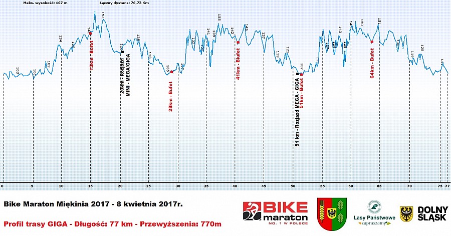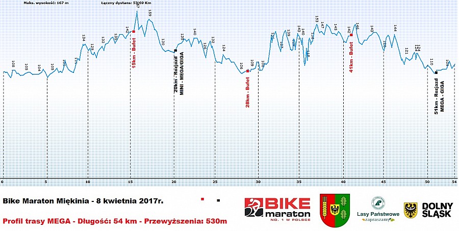 Na pierwszym w tym roku dystansie MINI czekają nas 24 km, na MEGA 54, a na GIGA 77 km. Na najdłuższym dystansie przewyższenie 770 m nie powala, ale łatwo nie będzie. Błoto raczej znów będzie gwarantowane, a kapryśna wiosenna aura może co prawda miło zaskoczyć, ale może też brutalnie zweryfikować nasz wiosenny głód ścigania. Miękinia to nie tylko rozgrzewka przed górami. To po prostu kawał maratonu MTB udowadniający, że kolarskie życie istnieje również poza górami.