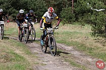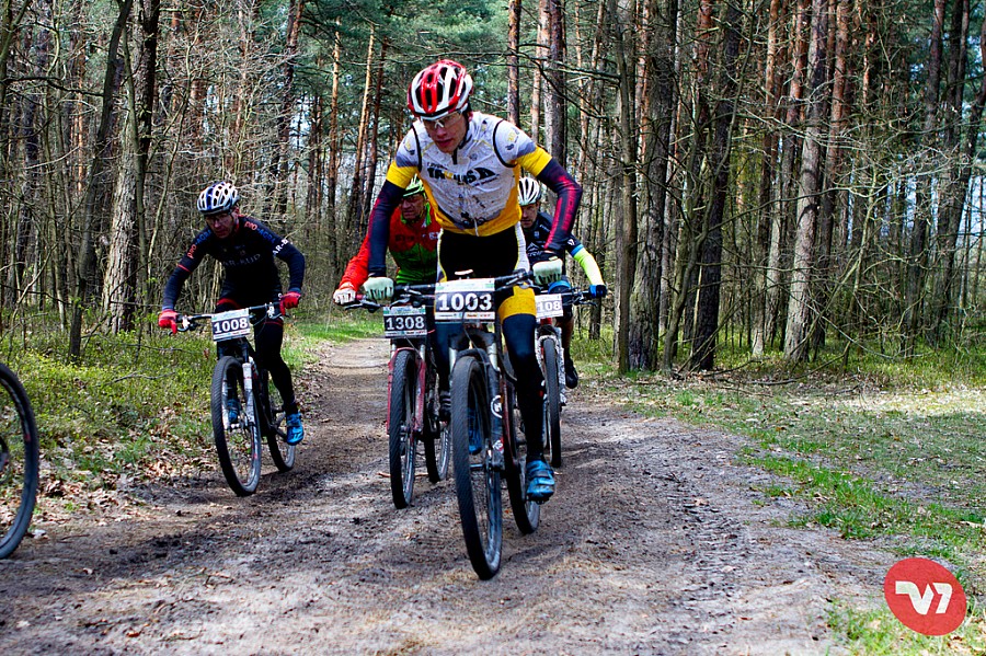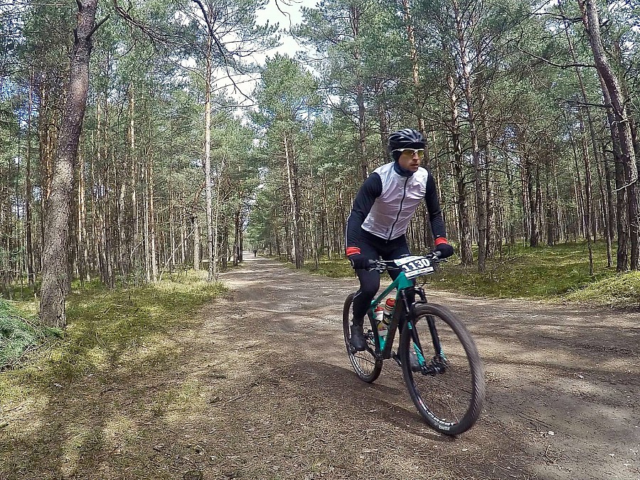 Start bez opóźnień, ja jechałem z pierwszego sektora więc z ludźmi raczej ogarniętymi w temacie przepychanek, zajeżdżania drogi itp. Po starcie wszystko poszło bez najmniejszych problemów. Pierwsze kilka kilometrów sektor szedł w całości. Rozciągnęło go dopiero kiedy wjechaliśmy w węższą niż typowa szutrowa autostrada, leśną ścieżkę, a całkiem go rozwaliło kiedy pojawiła się na horyzoncie wielka bagnista kałuża. Nie dość, że trzeba było ją „przepłynąć wpław” – a ja z roweru schodzić nie lubię – to jeszcze wybrałem kolejkę, w której jakiś geniusz zahaczył rower o gałąź i blokował innych kilkanaście sekund. Już wtedy wiedziałem jak będzie wyglądać ten wyścig – będę gonić… zresztą jak zwykle. Coś jest z tymi moimi pierwszymi minutami wyścigu, że ja zawsze później muszę nadrabiać. Całe szczęście nie byłem w tym osamotniony – Jakub Cichy z Opony Serafinowski chyba też utknął i w zasadzie razem ciągnęliśmy przez prawie 15 km do momentu kiedy przed pierwszym poważniejszym podjazdem mi odjechał (to był ok. 25 km). Kolejne kilka kilometrów walczyłem solo i muszę przyznać, że całkiem nieźle mi to szło. W okolicach 30 km (w tym kilku podjazdów, zjazdów i technicznych singli) zauważyłem przed sobą kilkuosobową grupkę… tak się na nią zapatrzyłem, że (zupełnie nieświadomie) razem z nimi pomyliłem trasę. W zasadzie to od tego momentu nie działo się za wiele, oprócz tego, że w którymś momencie ponownie pomyliliśmy trasę (ale na baranków ingerujących w oznaczenie rady niestety nie ma). Ostatnie kilometry przed metą to rozgrywka między otaczającymi mnie zawodnikami – tym razem ja byłem dołem. Nie wiem dlaczego, ale podczas wyścigu bardzo mało piłem (0,7l izotoniku) a nowe żele w jakie się uzbroiłem okazały się absolutnym niewypałem zaklejającym gębę więc ich (sic!) nie jadłem. Dokładając do tego wystrzelanie się ciągnąc grupkę i jadąc solo na 5 km przed metą poskutkowało odcięciem prądu (na ostatnich 5 km średnia moc z prawie 3h spadła mi z 298 na 293) i skurczami. Niestety – za głupotę trzeba płacić. Na mecie chłopaki zrobili mnie na cacy, organizator dołożył 15 minut kary za skrócenie 3,3 km (wygląda na to, że niezły podjazd tam musiał być ?? ) i ostatecznie zająłem 6 miejsce w kategorii M30-39 i 15 OPEN."