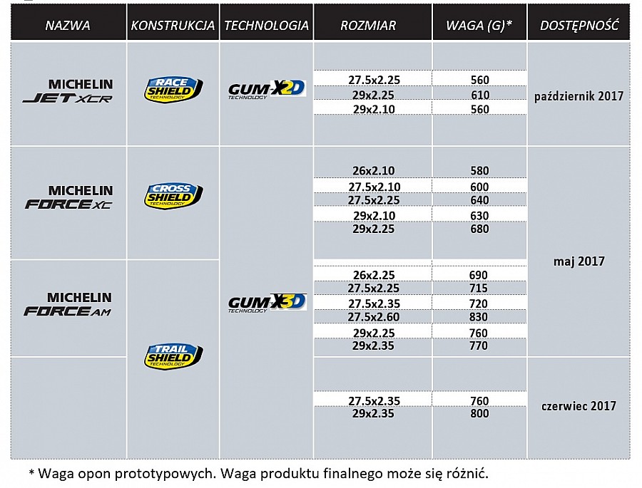 Co ważne firma przygotowała tylko 16 rozmiarów, co ma ułatwić orientację w gamach. Zastosowane rozwiązania technologiczne sprawiają, że każda z gam jest przeznaczona na różne podłoża i warunki użytkowania, jednakże poszczególne modele zostały tak opracowane, że opony różnych gam można łączyć w wyposażeniu jednego roweru. Unikalne połączenie mieszanek gumy nowej generacji, nowych rzeźb bieżnika i konstrukcji karkasów oznacza, że użytkownik w pełni wykorzysta potencjał osiągów opon, nie tracąc przy tym na ich wytrzymałości.
