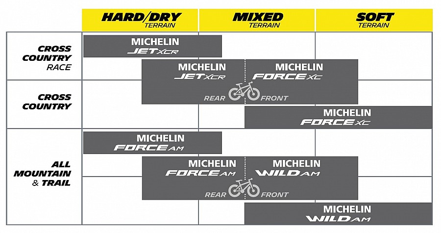 Wraz z rozwojem kolarstwa górskiego i coraz większą liczbą typów rowerów, specjalizacja następuje również w przypadku ogumienia. Producenci opon muszą dziś wychodzić naprzeciw różnorodnym oczekiwaniom użytkowników. Mając to na uwadze, Michelin opracował cztery różne gamy opon rowerowych do dwóch obszarów użytkowania: