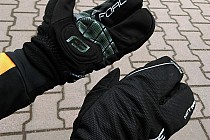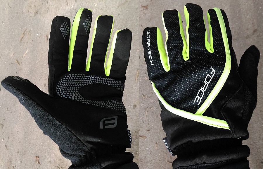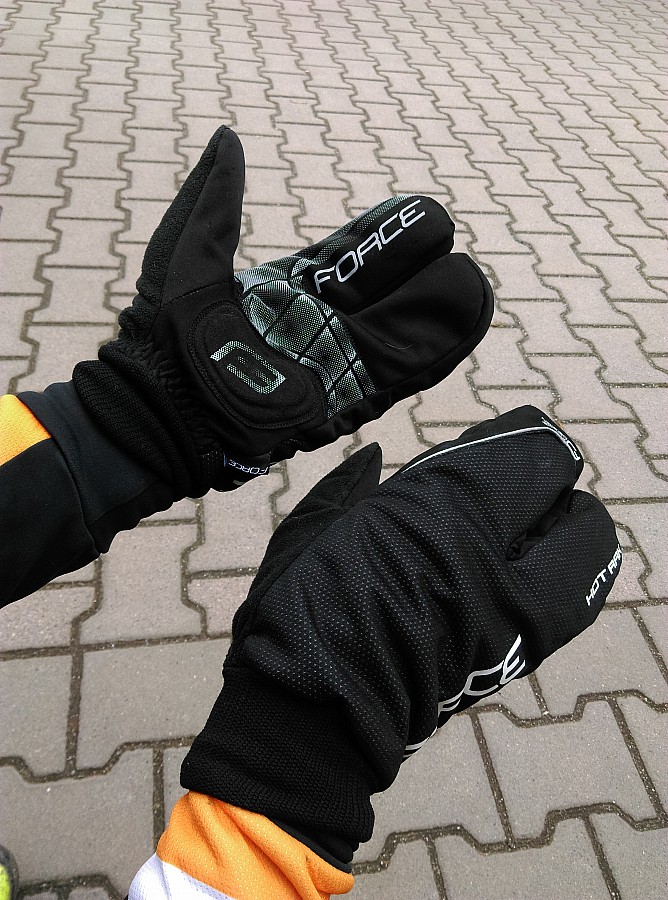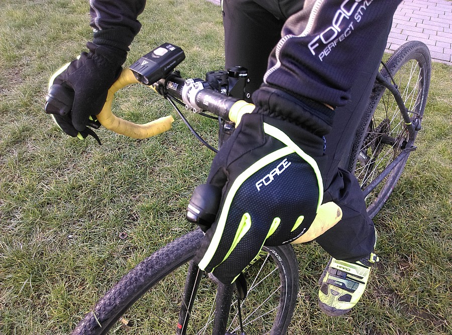 Żeby mieć pełną kontrolę nad rowerem założyłem tradycyjne rękawice z pięcioma palcami — Force Ultra Tech. Zapewniają one nieco mniejszy komfort cieplny, ale można pojeździć nawet w trudnym terenie, ciesząc się pełną kontrolą nad rowerem zarówno przełajowym, jak i MTB. Przy umiarkowanym tempie jazdy (tętno 120-140 uderzeń/min) lub jeździe po mieście z zatrzymywaniem się na skrzyżowaniach dobrze się czułem w temperaturze nieznacznie poniżej 0 st. C. Intensywny trening można wykonać nawet przy mroźnej pogodzie.