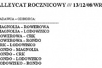 W sobotę, 25 października, odbył się XI wrocławski Alleycat. Organizatorem "Bardzo szybkiego Alleycat'a" był Garfild, który przygotował rzeczywiście bardzo szybką trasę. Zwycięzcą okazał się Kola. Zawodnicy wystartowali w okolicach CH Korona i musieli udać się od razu na drugi kraniec Wrocławia - do czołgów stojących przy ul. Karkonoskiej. Na pierwszym punkcie kontrolnym czekało dla każdego dość wyszukane pytanie (np "jaka jest prędkość rozchodzenia się dźwięku w betonie"). Odpowiedzi znajdowały się po drugiej stronie bardzo ruchliwej ulicy. Po uporaniu się z tym zadanie trzeba było dojechać do kolejnego punktu kontrolnego, który ulokowany został przy kościele Marii Magdaleny. Tam można było uzyskać informację, iż 3 punkt kontrolny znajduje się przy bramie głównej...