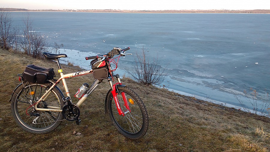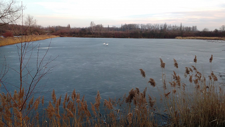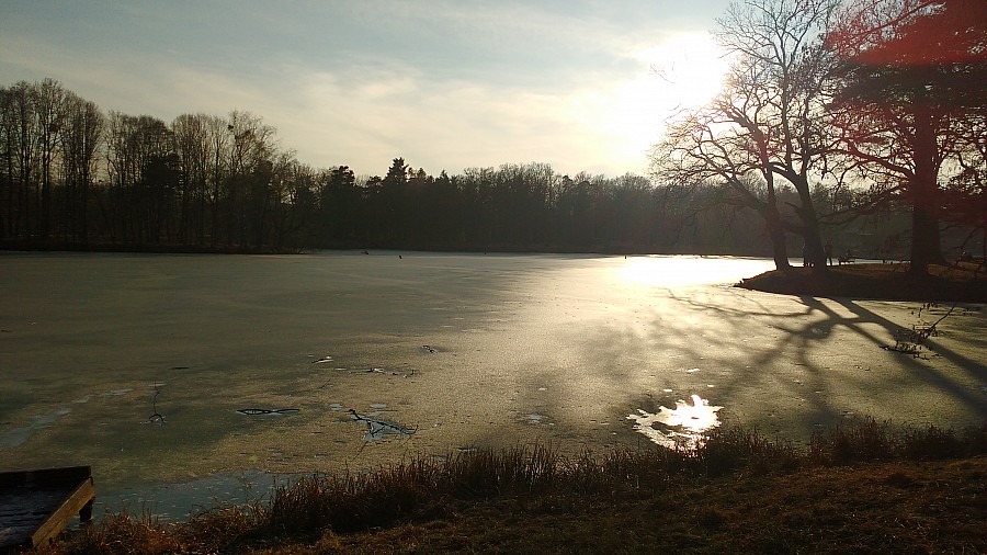 W Świerklańcu przeciskam się przez zatłoczony park i dojeżdzam na wał jeziora Świerklanieckiego które po ostatnich mrozach jeszcze całe pokryte jest lodem.
