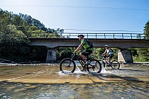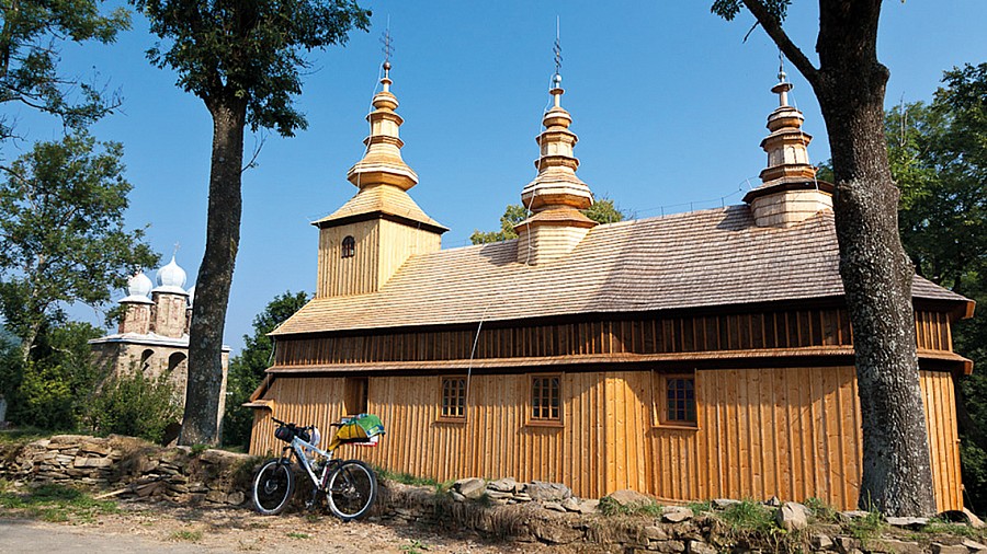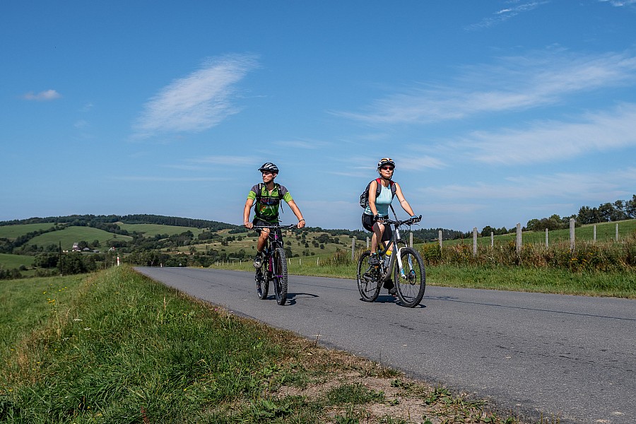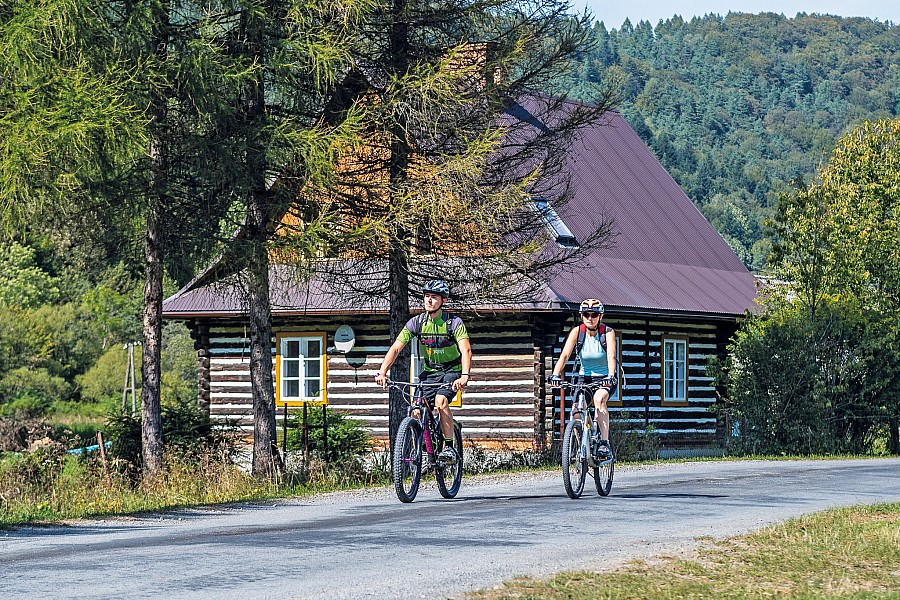 OPIS TECHNICZNY: Łatwa trasa z jednym wymagającym podjazdem – z Prełuk do Komańczy. Utrudnieniem, a może urozmaiceniem, będą przejazdy w bród przez koryto Osławy. Po drodze poznamy wiele miejsc odludnych. Na bazę wycieczki wybieramy Komańczę. Stąd kierujemy się drogą wojewódzką na południe. Przez znaczną część trasy towarzyszyć nam będą znaki czerwonego szlaku rowerowego. W Radoszycach na rozjeździe odbijamy w prawo, aby zwiedzić tę interesującą wioskę. Najpierw jednak podjedziemy nieco wyżej do radoszyckiego źródełka. W drodze powrotnej przejedziemy wzdłuż zabudowań wsi, wypatrując starych chat łemkowskich oraz drewnianej cerkwi . Drogą wojewódzką kierujemy się dalej na południe, w stronę malowniczej doliny Osławicy. W Nowym Łupkowie odchodzi w prawo droga do głównej części wsi, gdzie znajduje się słynna stacja kolejowa, na której w 1880 r. ponad 300 galicyjskich dygnitarzy żegnało Cesarza Franciszka Józefa I po wizytacji Twierdzy Przemyśl. Z widokowego Rysawskiego Wierchu opadamy w dolinę potoku Smolnik. Na dwudziestym kilometrze zjeżdżamy z drogi wojewódzkiej w lewo, w kierunku wsi Smolnik. Od tej pory aż do Prełuk pojedziemy wzdłuż rzeki Osławy. Kierujemy się cały czas drogą asfaltową na północ, mijając po drodze cerkiew w Smolniku , a nieco dalej stromy stok Kiczary, na którym usytuowane jest schronisko z lądowiskiem dla małych samolotów. W drodze do Duszatyna przyjdzie nam czterokrotnie przeprawić się w bród przez Osławę, po betonowych płytach. Za Duszatynem pojedziemy wzdłuż rezerwatu chroniącego malowniczy przełom tej rzeki . W Prełukach, za mostem i linią kolejową jedziemy w lewo. Szutrówka serpentynami wspina się na przełęcz, by po chwili zjazdem doprowadzić nas na obrzeża Komańczy.