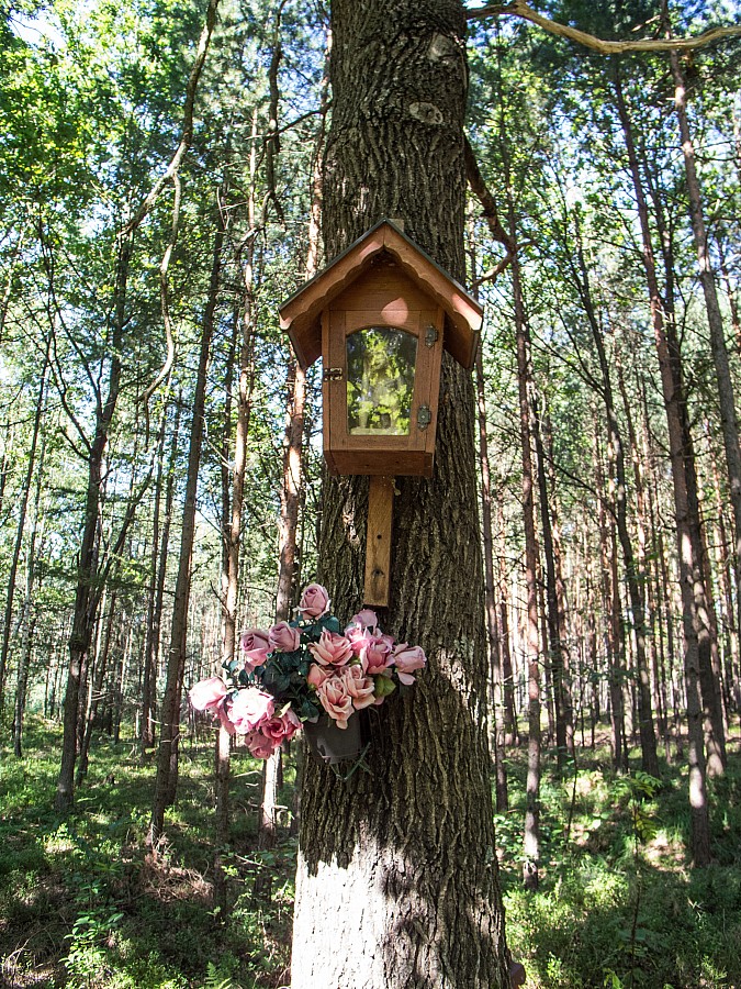 Rekreacyjna pętla po Puszczy Sandomierskiej , ze startem i metą nieopodal Stalowej Woli. Łatwa technicznie trasa przebiega w większości po lokalnych asfaltach, wydzielonych drogach dla rowerów oraz leśnych utwardzonych drogach. Częściowo pojedziemy za istniejącymi lecz niedostatecznie wyznakowanymi w terenie szlakami rowerowymi. Samochód możemy zostawić na parkingu obok obiektu rekreacyjno-turystycznego „Grzybek” przy Ścieżce Edukacyjno – Przyrodniczej „Ciemny Kąt” Nadleśnictwa Rozwadów. Kierujemy się na północ lokalną drogą pomiędzy Rudą a Stalową Wolą, dojeżdżamy do cmentarza i skręcamy w prawo. Jedziemy wydzieloną drogą dla rowerów, równolegle do ulicy Ofiar Katynia. Stąd możemy odbić do centrum miasta, by zobaczyć drewniany kościółek św. Floriana – dojazd ul. Popiełuszki, Okulickiego i Floriańską. Przejeżdżając przez Stalową Wolę na pewno zwrócimy uwagę na przemysłowy charakter miasta, o czym świadczy chociażby mijana przez nas Huta Stalowa Wola. To wielkie przedsiębiorstwo produkcyjne wybudowano w ramach infrastruktury składającej się na Centralny Okręg Przemysłowy. Kontynuujemy jazdę ul. Ofiar Katynia, po czym skręcamy w prawo, w ulicę Solidarności. Za przejazdem kolejowym kończy się wydzielona ścieżka dla rowerzystów. Jedziemy na wprost ulicą Wczasową, Wańkowicza i Wrzosową. Za pętlą autobusowa skręcamy w prawo, w ulicę Sosnową i jedziemy najpierw asfaltem, a następnie szutrową leśną drogą przez około 3 km aż do skrzyżowania z drogą wojewódzką numer 872. Przecinamy ją i jedziemy prosto asfaltową drogą pożarową numer 4 do miejscowości Maziarnia. Przy końcu wsi, na 20,2 km trasy, skręcamy w prawo, w wąską asfaltową drogę, która następnie zmienia kategorię na szutrową. Trzymamy się głównego utwardzonego ciągu, po czym wracamy do drogi wojewódzkiej. Skręcamy w lewo, by po 1200 metrach zjechać w prawo, w kierunku miejscowości Ruda. Przed cmentarzem wojennym z I wojny światowej skręcamy w lewo i jedziemy ulicą kard. A. Sapiechy aż do kościoła parafialnego w Rudzie. Nasza trasa łączy się ze szlakiem niebieskim. Za jego znakami podążamy do miejscowości Brudze. Przed kościołem znajduje się pomnik przyrody – okazały dąb. Mijamy wieś, skręcamy w lewo, w kierunku Stalowej Woli. Po lewej stronie usytuowany jest poligon wojskowy. Po około dwóch kilometrach zjeżdżamy w prawo, do lasu i wracamy na parking przy „Grzybku”.