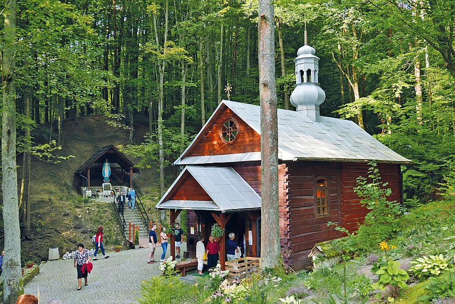 Z Horyńca-Zdroju – uzdrowiska słynącego z najlepszych zasobów borowiny w Polsce pojedziemy do cerkwi w Radrużu i leśnej kaplicy w Nowinach Horynieckich. Zaparkować możemy w centrum zdroju. Z parkingu przy ulicy Mickiewicza kierujemy się deptakiem do przejścia podziemnego. Wychodzimy po drugiej stronie linii kolejowej, obok budynku Informacji Turystycznej. Stąd ulicą Sanatoryjną, prowadzącą wśród domów zdrojowych, kierujemy się na północ. Jedziemy łagodnie falującą drogą asfaltową przez las. W Świdnicy dołącza do nas szlak Green Velo. Na skrzyżowaniu w Nowym Bruśnie skręcamy w prawo, mijamy MOR i po chwili naszym oczom ukaże się piękna drewniana cerkiew św. Paraskewy . Przed nami widokowy podjazd na Hrebciankę. Zalesiony szczyt wzgórza skrywa wiele tajemnic z czasów II wojny światowej. Znajduje się tu sześć bunkrów będących częścią umocnień Lini Mołotowa. Po krótkim zjeździe docieramy do agroturystyki Polanka. Na rozdrożu szlak Green Velo biegnie prosto, my skręcamy w prawo, za znakami czerwonego szlaku rowerowego. Przed nami kolejny podjazd. Po wyjeździe z lasu kierujemy się w prawo i po około dwóch kilometrach docieramy do drogi asfaltowej. Skręcamy w prawo, a następnie w lewo. Droga stromo opada do doliny potoku Dubleń. Docieramy do Nowin Horynieckich. Za drogowskazem kierujemy się w lewo, do kaplicy leśnej. Przejeżdżamy przez wieś, po czym odbijamy w prawo i szutrową drogą wraz z zielonym szlakiem pieszym zjeżdżamy na parking. Leśną alejką docieramy do kaplicy z cudownym źródłem . Dalej trasa prowadzi przepustem pod nasypem linii kolejowej, a następnie stromą ścieżką pod górę do leśnej drogi asfaltowej. Jedziemy nią w prawo przez 1,5 km, po czym odbijamy w lewo, w szutrową drogę, która zaprowadzi nas do drogi wojewódzkiej. Mijając klasztor Franciszkanów, kierujemy się na zachód, do centrum Horyńca-Zdroju. Stąd warto jeszcze pojechać około 3 km na południe, do Radruża, by zobaczyć jeden z najpiękniejszych zespołów cerkiewnych w Polsce . Powrót tą samą drogą.