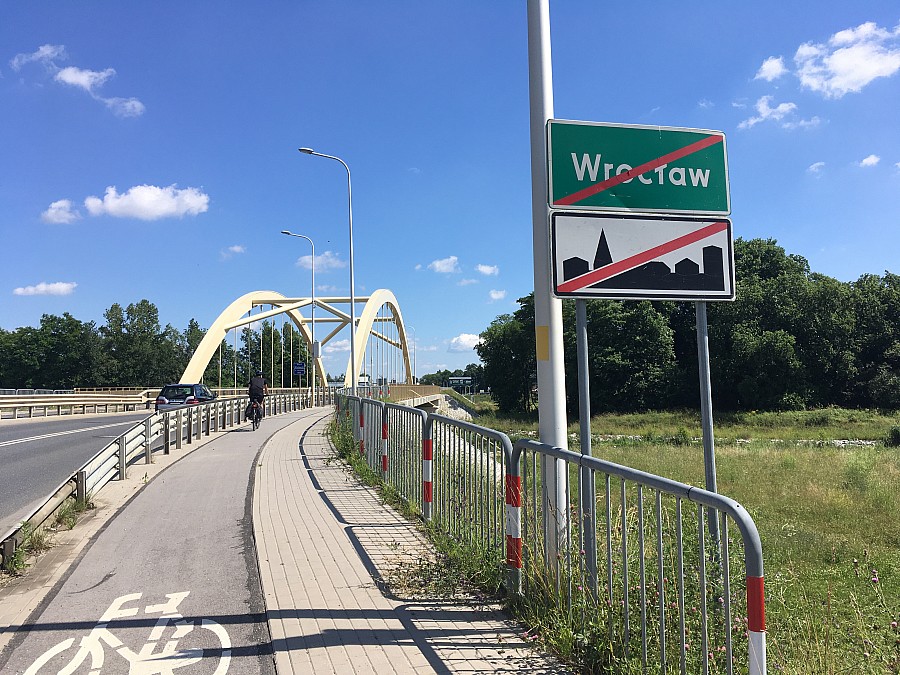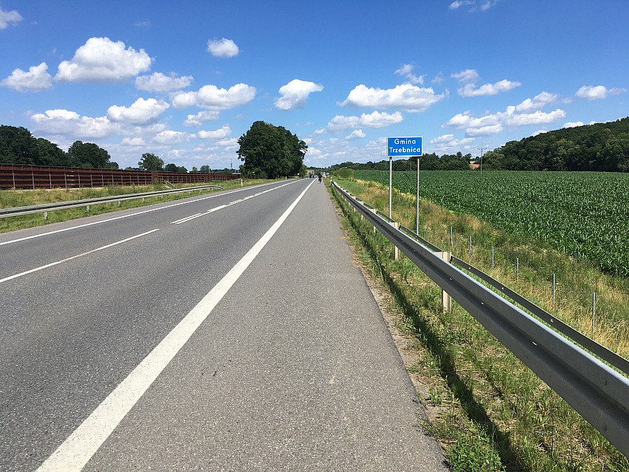 We Wrocławiu kierujemy się na północ wzdłuż Obornickiej, Bałtyckiej, Żmigrodzkiej, a później Sułowskiej. Przejeżdżamy most nad Widawą i wyjeżdżamy z Wrocławia. W Psarach jest fragment drogi gdzie musimy jechać po ulicy, na szczęście jest tam dość szeroko. Dalej kontynuujemy ścieżką rowerową (po lewej stronie jezdni, wyłożona kostką) wzdłuż głównej drogi. Ścieżka ta prowadzi nas aż za Wysoki Kościół, gdzie się urywa i znów trzeba wjechać na jezdnię. Na szczęście jest tutaj szerokie pobocze i można w miarę komfortowo dostać się do Będkowa. Tam znów zaczyna się ścieżka rowerowa, która zaprowadzi nas do Trzebnicy.