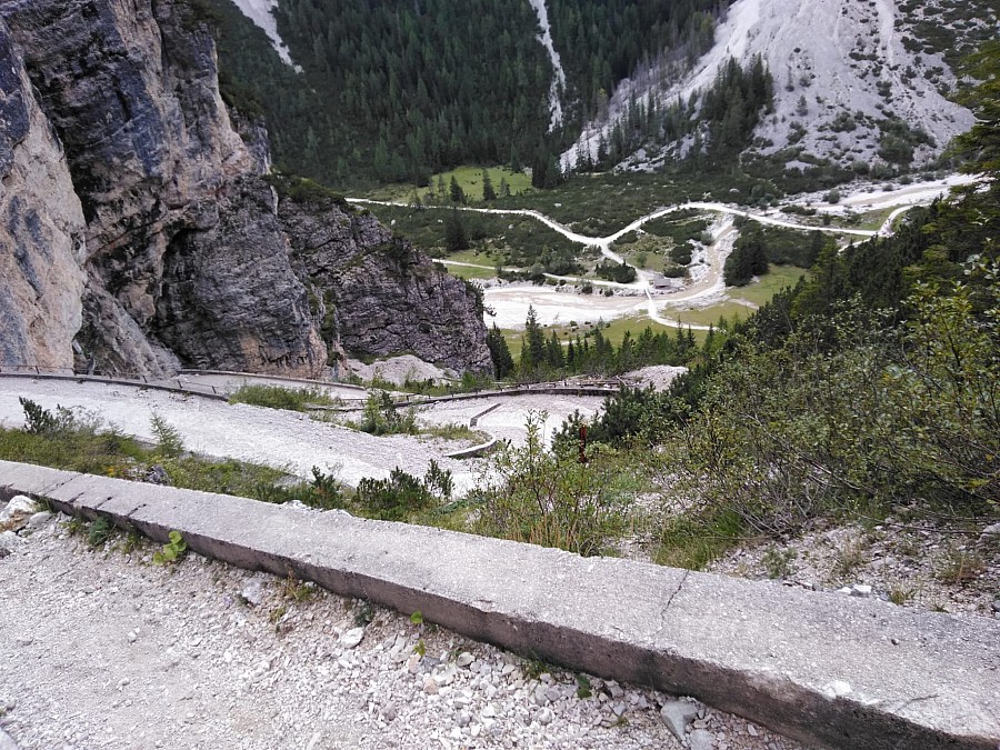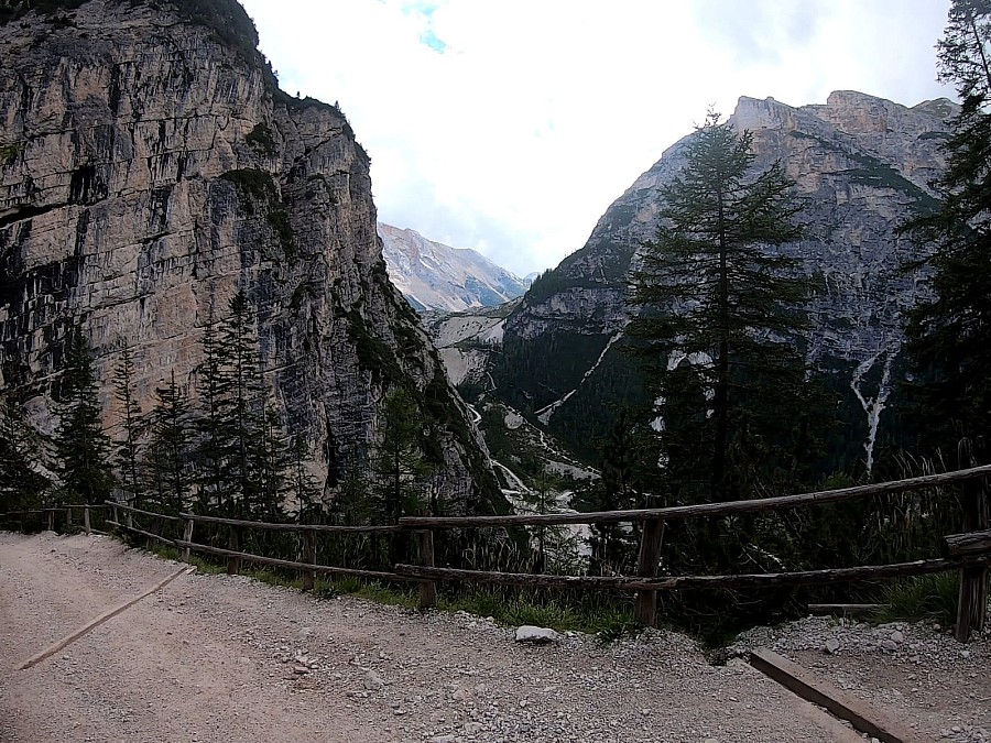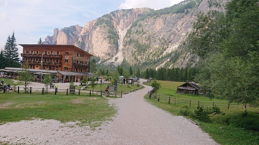 Wycieczkę można zacząć z centrum miasta przejeżdżając na drugą stronę rzeki pod stację kolejki linowej. Tam zaczyna się szeroki szuter prowadzący w górę rzeki. Droga wije się po zboczu górskim, ale jest dość łatwa do przejechania. Po wyjechaniu z miasta droga zmienia się w wąski singiel. Jedzie się bardzo przyjemnie krętą ścieżką w lesie pełną wystających korzeni. Niesamowicie wyglądają monumentalne, kilkuset metrowe ściany skalne górujące nad doliną. W ten sposób dojeżdża się do przepięknego miejsca, rozległej polany otoczonej ze wszystkich stron skalistymi górami. Na środku tej doliny stoi górski hotel z restauracją Pederü, idealne miejsce na kawę lub szybki posiłek.