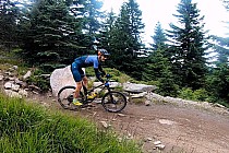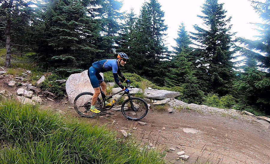 Wybraliśmy dość szybki szutrowy zjazd na wysokość ok 800m. Stąd zaczęliśmy podjazd. Początkowo ścieżka ma przyjemne nachylenie i tak ciągnie się aż do Żmijowej Polany. Odbijamy w lewo i niebawem przed nami ukaże się niezła ściana. To będzie ostatni kilometr podjazdu, który dobrze przetestuje naszą formę. Na górze czeka już na nas 6 kilometrowy singiel, najdłuższy w całym Bike Parku. W górnej części trochę kamieni i przepiękny krajobraz. Im dalej tym więcej zakrętów, fajnie wyprofilowane bandki, stoliki i muldy. I w takim przyjemnym nastroju dotrzemy do miejscowości Siena, gdzie znajdują się wyciągi na Czarną Górę.