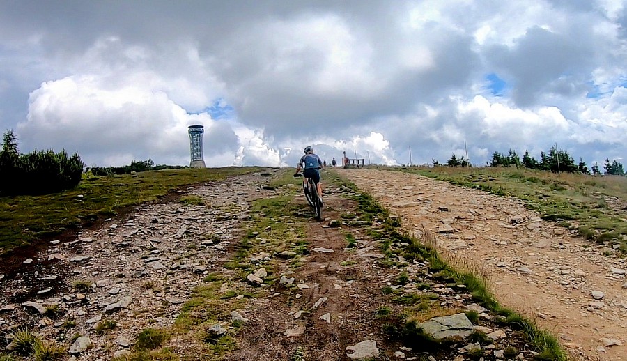 Od naszej ostatniej wizyty w 2008 roku w tym miejscu minęło sporo czasu i trochę się pozmieniało. W 2022 roku pojawiła się tam nowa wieża widokowa, a końcowa część podjazdu od schroniska (o nieco mylącej nazwie "Na Śnieżniku") stała się przejezdna, choć wymaga dobrej kondycji!